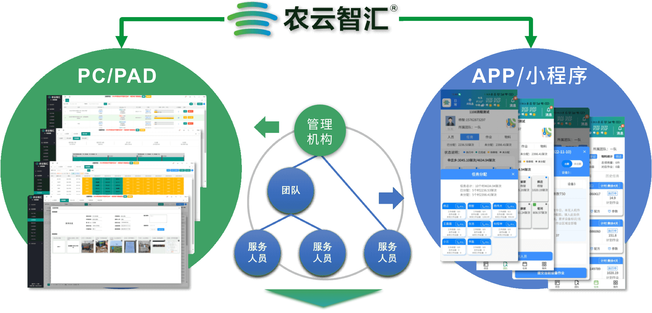 “农云智服” APP 是“农云智汇” ®系统的基础单元,面向农业服务人员提供围绕“农业服务”模型的各项管理功能,侧重于团队管理,流动服务,作业监管,功能包括且不限于:
